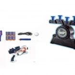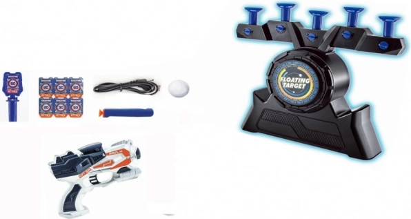 Ez a lövészeti szórakoztató készlet tartalmaz egy mozgó célt, két műanyag pisztolyt, nyilakat és egy labdát. A cél magassága 30 cm, és könnyen beállítható a játék különböző szintjeihez. USB kábellel vagy elemmel tölthető, ami rugalmasságot biztosít a használatban.