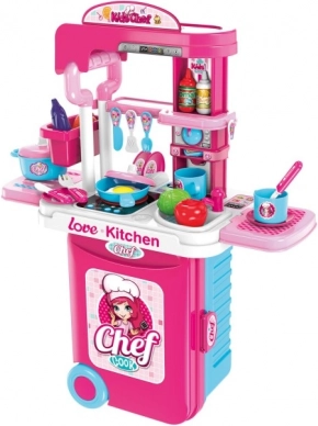 Bemutatjuk a Gyermek konyhai készlet 3 az 1-ben-t, amely kompakt kis bőröndben érkezik, ideális kis szakácsok számára. Ez a készlet könnyen alakítható asztali vagy klasszikus konyhai verzióvá: