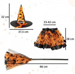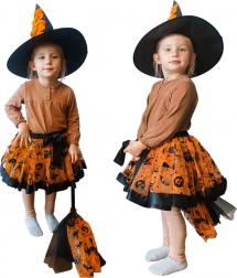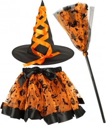 Ez a 3 részes boszorkányjelmez minden gyermeket kis varázslóvá változtat. A könnyű tütü szoknya rugalmas derékkal egész nap kényelmes, a magas, hegyes kalap varázslatos megjelenést ad, a seprű pedig teljessé teszi az öltözetet. A narancssárga, fekete denevér-, tök- és csillagmintákkal feltűnő és fotogén.