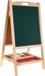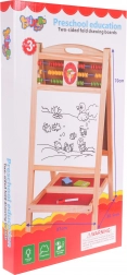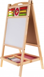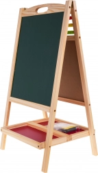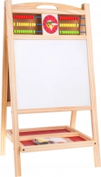 Fa, kétoldalas tábla abakusszal remek oktatójáték 3 éves kortól. Ez a multifunkciós tábla egyik oldalán fehér, mágneses felületű, a másikon krétával írható felület található. A fehér oldalra a csomagban található filctollal lehet írni. A filc mágneses, és szivaccsal törölhető kupakkal rendelkezik. A tábla felső részén abakusz és mozgatható mutatókkal ellátott óra található. A krétás oldalra a csomagban lévő krétákkal lehet rajzolni, majd mindent a szivaccsal letörölni.