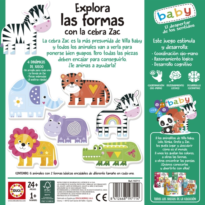 EDUCA Baby beillesztő játékszett edzőpálya a gyerekek számára, ahol megismerhetik az alapvető geometriai formákat szórakoztató és felfedezésre ösztönző módon. A nagy és vastag darabok miatt a manipuláció biztonságos és kényelmes a kis kezek számára.