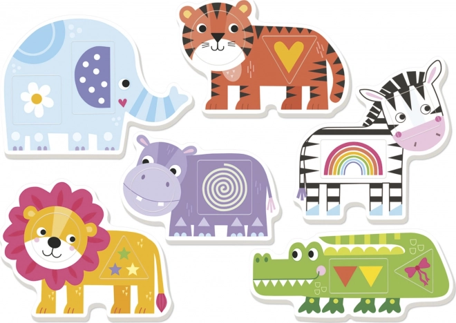 A játék 6 állatot tartalmaz, 2 összekapcsolt formával, amelyek minden gyermeket szórakoztatnak.