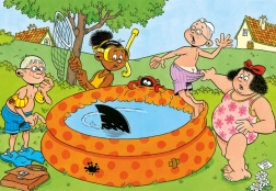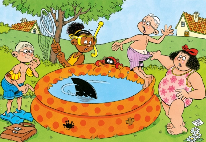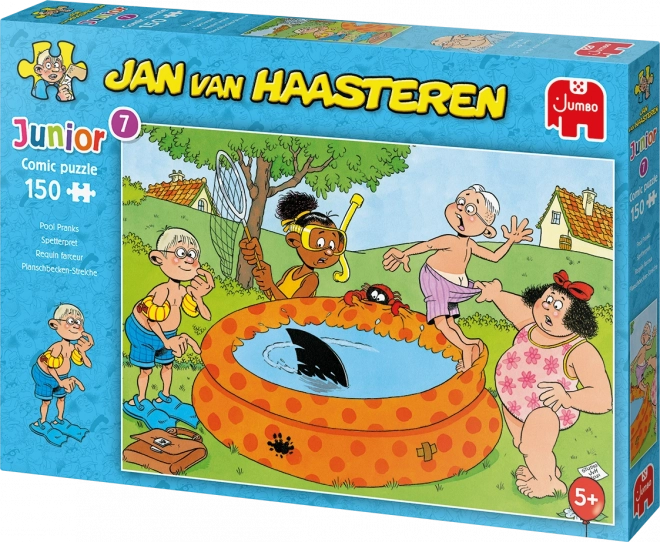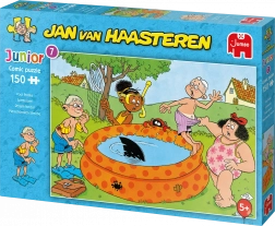 Merüljön el a Junior sorozat őrült jeleneteiben – Tréfák a medencénél a legendás karikaturista, JAN VAN HAASTEREN tollából. A jellegzetes motívumok, mint a cápauszony, a váratlanul felbukkanó gazdátlan kezek, a fogprotézis, a Mikulás és az alkotó önarcképe a kirakást nevetéssel teli kereső kalanddá varázsolják.