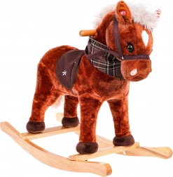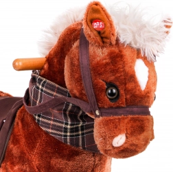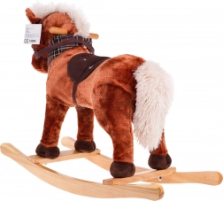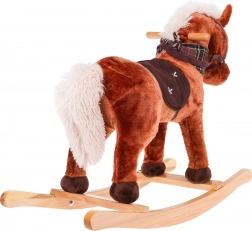 Ez a minőségi, barna színű hintaló minden kis lórajongónak örömet szerez. A stabil fa talpak és a masszív fogantyúk biztonságos, kényelmes hintázást biztosítanak, a puha plüss melegen ölel és simogatásra csábít. Az integrált nyerítés- és ügetéshangok támogatják a fantáziát, és kalanddá varázsolják a játékot.