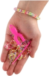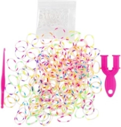 Tartalmazza a karkötők készítéséhez szükséges mindenet - 200 szivárványos gumi, horgoló és kapcsok.