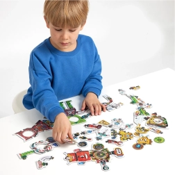 A játék ösztönzi az önálló felfedezést, fejleszti a szem–kéz koordinációt, és megtanít tervezni, kísérletezni. A kétoldalas darabok, az élénk színek és a részletgazdag illusztrációk serkentik a képzelőerőt és a szókincset a robotokról és feladataikról szóló mesélés közben.