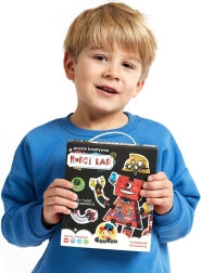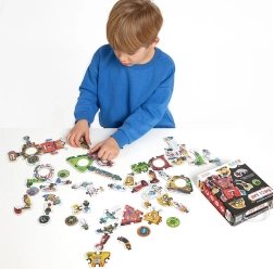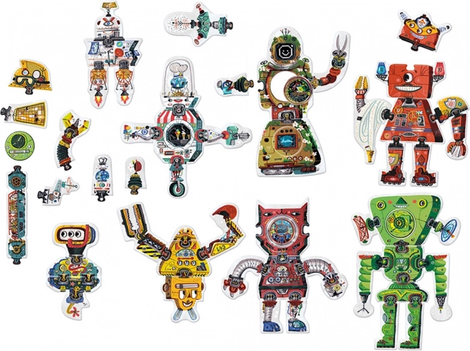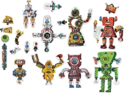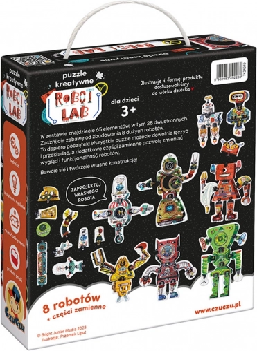 A Robot Lab kreatív puzzle végtelen összeállítási lehetőséget kínál. Alapját 63 minőségi, fényes felületű és precízen kivágott darab alkotja, amelyek az okos formatervezésnek és illusztrációknak köszönhetően remekül illeszkednek egymáshoz. A gyerekek először 8 nagy robotot rakhatnak ki, majd „pót” alkatrészek segítségével átalakíthatják külsejüket – vagy teljesen új figurákat és gépeket hozhatnak létre.