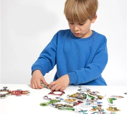 Fedezd fel a robot témájú kreatív puzzle-t, amely 63 masszív kartondarabot tartalmaz, ebből 28 kétoldalas. A darabok tetszés szerint kombinálhatók, így a gyerekek akár 8 nagy robotot is összeállíthatnak, majd külsejüket és funkcióikat korlátlanul változtathatják. A játék fejleszti a finommotorikát, a logikus gondolkodást, a kreativitást és a türelmet – ideális szórakozás műszaki érdeklődésű óvodásoknak.
