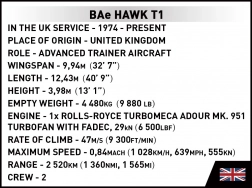 A COBI Fegyveres Erők BAe Hawk T1 egy építőkészlet, amely lehetővé teszi, hogy megépítse egy repülőgép modelljét, amely 1976 óta szolgál a brit királyi légierőnél (RAF). Ez a készlet ideális minden légi modellezési és katonai technika rajongójának. A modell 1:48 méretarányban van megtervezve, és 362 elemet tartalmaz, amelyek együtt alkotják a 19,5 cm szárnyfesztávú szárnyakat. A modell nyitható pilótafülkével és levehető kerekekkel rendelkezik a látványos kiállításhoz.