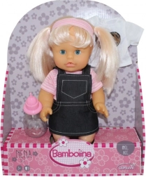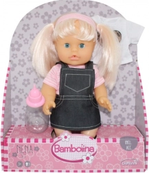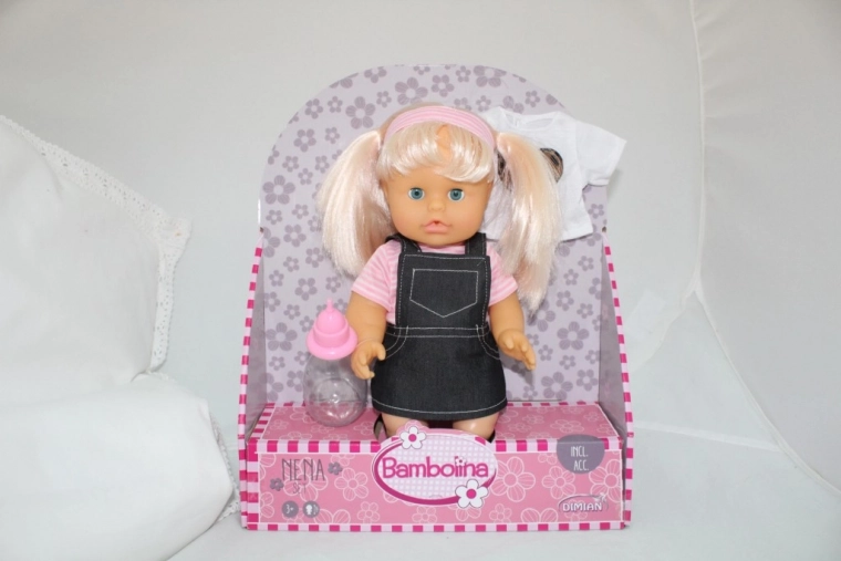 A szőke copfos baba a Bambolina márka mutatós rózsaszín dobozában érkezik – készen arra, hogy ajándékként örömet szerezzen.