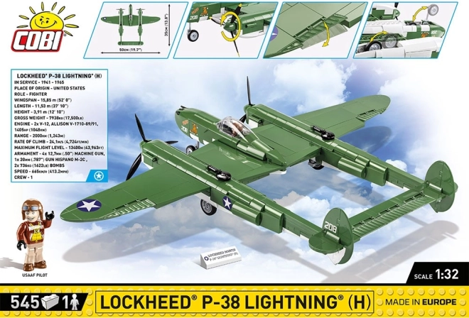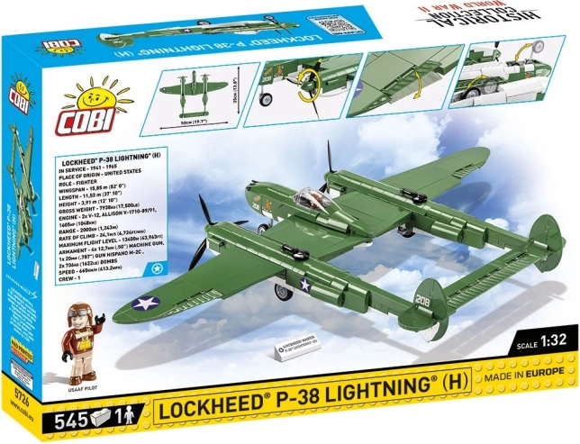 Építsd meg a II. világháború legendás amerikai vadászrepülőgépét – LOCKHEED P–38 LIGHTNING 1:32 méretarányban a COBI-tól. A készlet 545 elemet, részletes matrica nélküli nyomatokat, mozgó elemeket (légcsavarok, fékszárnyak, futómű) és nyitható kabint pilóta figurával tartalmaz. A hivatalos LOCKHEED MARTIN licenc garantálja az ikonikus „Repülő villám” hű megjelenítését.