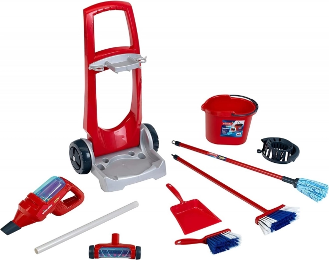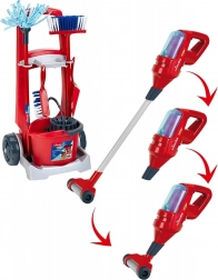 A kocsi különféle takarító eszközöket tartalmaz, mint például mop, seprű és törlőkendő, így számos játék lehetőséget nyújt a gyerekeknek.