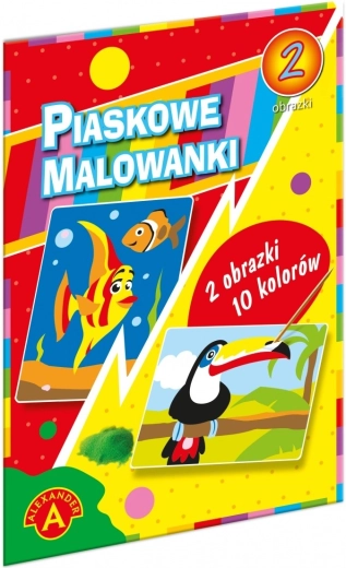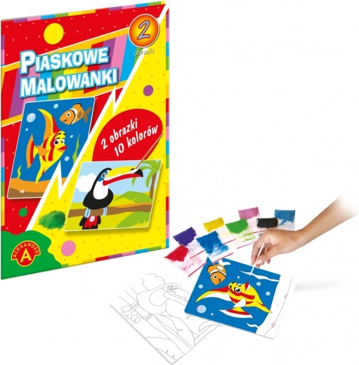 - 2 kép kiszínezéshez; spatula; 10 tasak színes homok; papír alátét; útmutató