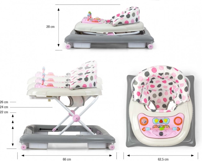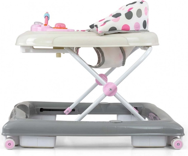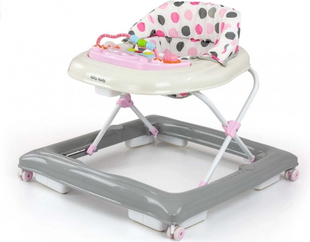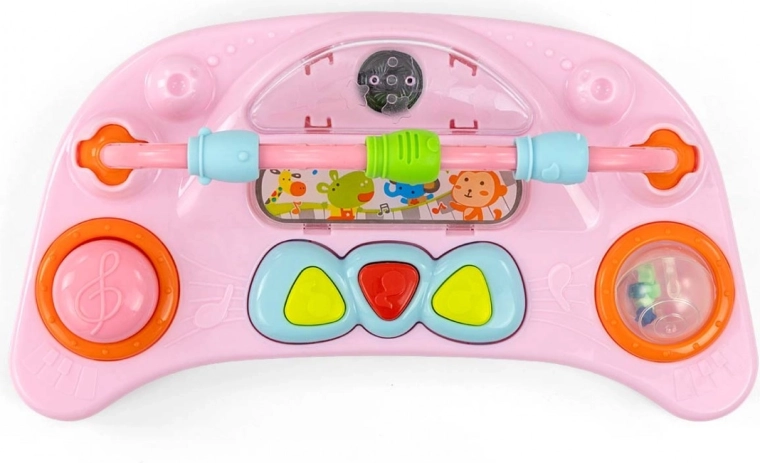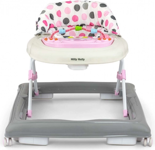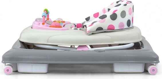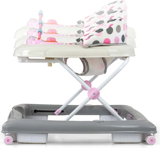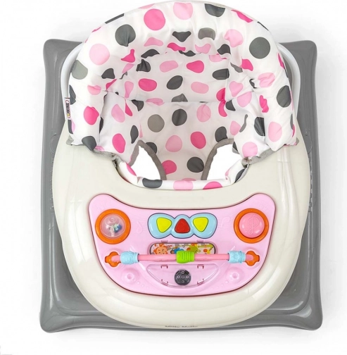 A termék egy oktató panelt tartalmaz, amely számos meglepetést rejt a kis felfedezőknek: fények, sípok, dallamok, csörgő, gombok és más mozgó elemek. A panelt a járássegítő tálcájából kivéve önálló játékként is használható, például úti társként, a felső rész pedig játszóasztalként szolgálhat.