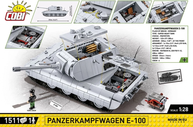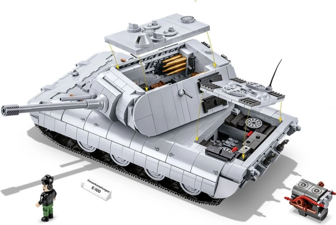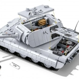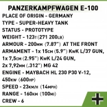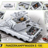 Építse meg a lenyűgöző, szupernehéz harckocsi PANZERKAMPFWAGEN E‑100 prototípusát nagy, 1:28 méretarányban, 1511 elemből. A modell forgatható toronnyal, mozgatható ágyúval, működő lánctalpakkal, a torony és a test belső teréhez való hozzáféréssel, valamint kivehető motorral rendelkezik a szerviznyílás alatt. Tartozék egy harckocsizó minifigura és egy névtábla – tökéletes darab gyűjtőknek és hosszú órákon át tartó építéshez.
