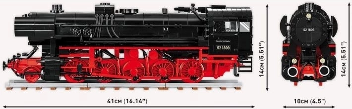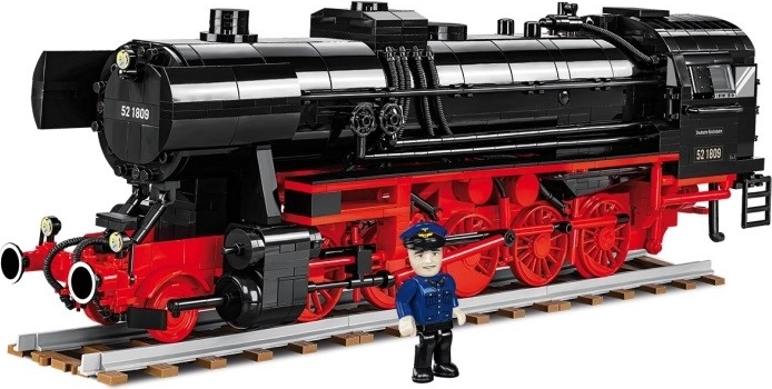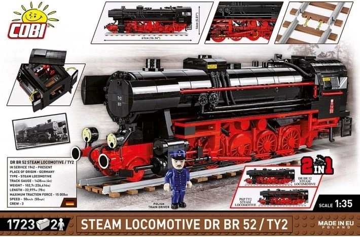A második világháborús DR BR 52 / TY2 német gőzmozdony blokkmodell-készlete a COBI teljesen új, Vonatok kollekciójának része. Az építőkészlet hűen adja vissza a legendás gőzmozdony kasztniját, arányait és részleteit, amely valószínűleg a világ minden vasútbarátja számára a legkedveltebb és legismertebb. A 2 az 1-ben különkiadás kétféle kiegészítő kockaszettet tartalmaz, amelyek lehetővé teszik a második világháborús időszak német jelöléseivel ellátott DR BR 52 német mozdony, vagy a háború utáni Lengyel Népköztársaság időszakából származó, a Lengyel Államvasutak (PKP) jelöléseit viselő mozdony megépítését. A különböző, eltérő nyomtatott szimbólumokkal, számozással és jelölésekkel ellátott elemek mellett a készlet a lengyel kivitelhez átdolgozott, nagyobb első és hátsó lámpákat, eltérő színűre festett kiválasztott kockákat, valamint két különböző figurát is tartalmaz: egy, a második világháború időszakából származó német mozdonyvezetőt és egy háború utáni PKP-egyenruhás lengyel mozdonyvezetőt a jellegzetes állami címerrel – a kommunisták által eltávolított koronás lengyel sassal.