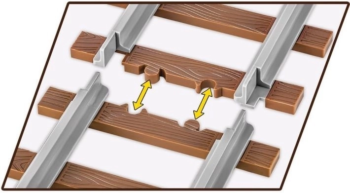 A készlet része két cserélhető névtábla is, amelyek közül választhat: német BR 52 és lengyel Ty2. A COBI saját formájú kockát is készített a pályaszakasz reprodukálására. A dobozban öt ilyen szakasz található, összesen kb. 65 cm hosszban. A sínek korszerű, kétkomponensű fröccsöntési technológiával készülnek, ami azt jelenti, hogy az egyes, kb. 13 cm hosszú, egy darabból álló elemek két különböző színű műanyagból készülnek, amelyek egymáshoz kapcsolódnak. Az acélszürke sínszálak jól elkülönülnek a rendkívül élethű barna vasúti talpfáktól. Az egyes talpfákon nem láthatók tüskék (csapok), ami növeli a realisztikusságot, és mindegyiket deszkaszerkezet, azaz famintázat borítja. A sínek rögzíthetők építőlapokra, és technikai furattal is rendelkeznek, így például csavarral vagy szöggel fixen a vasúti diorámához erősíthetők.