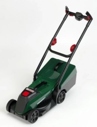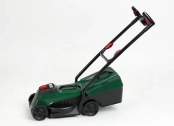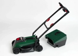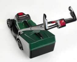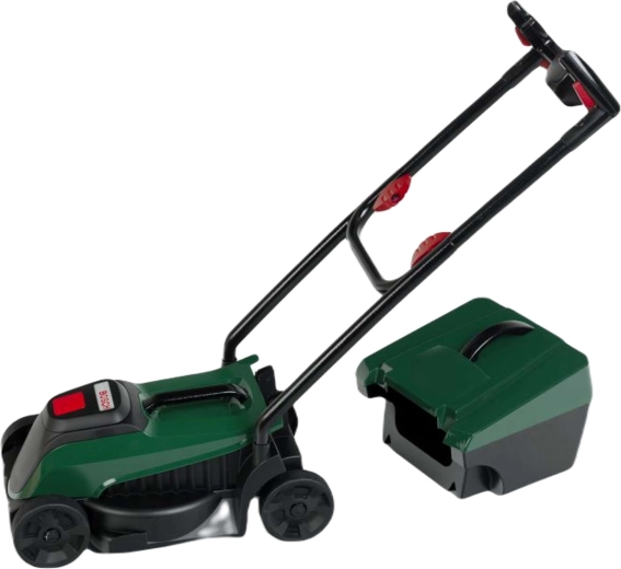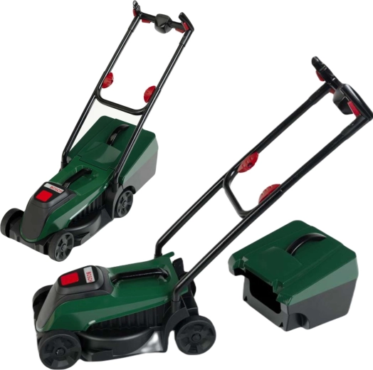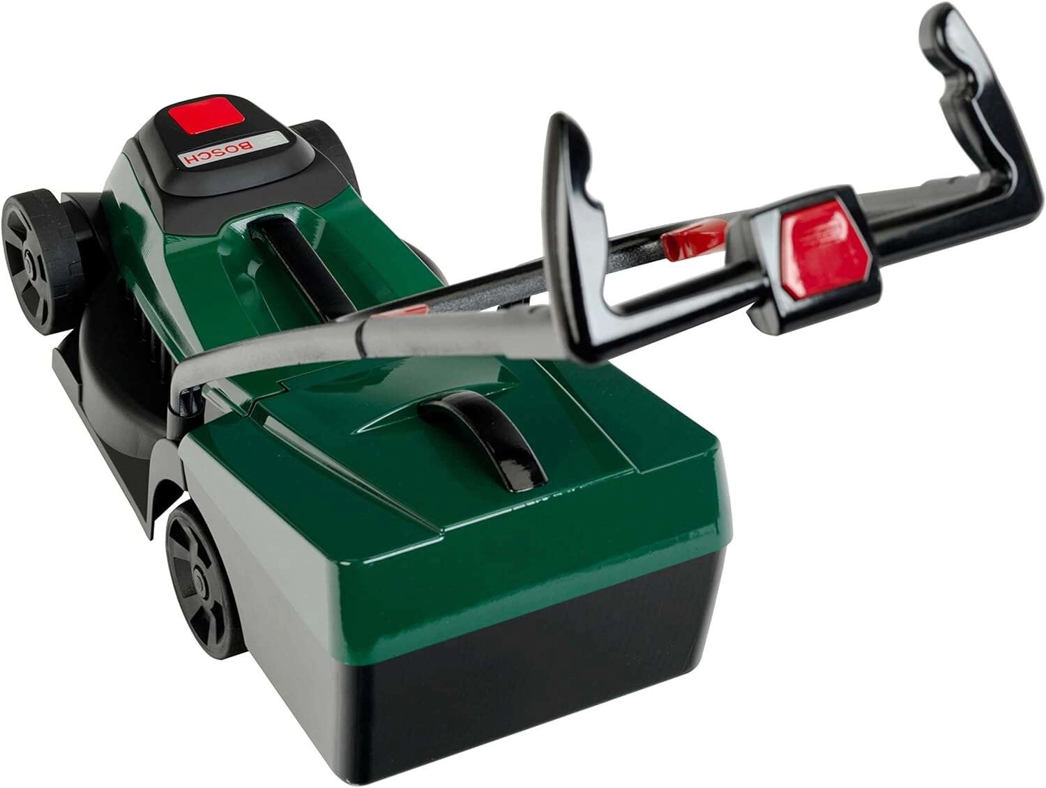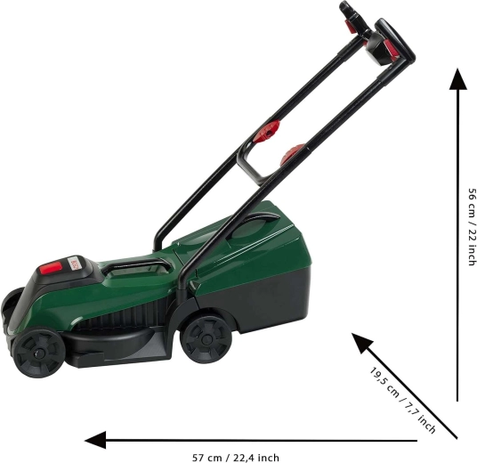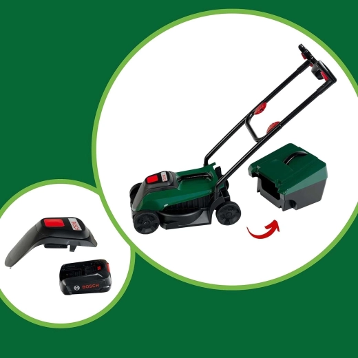 Ez a gyerek fűnyíró hűen utánozza a valódi gépet: sötétzöld ház, fekete fogantyú és gördülékenyen futó kerekek, amelyek különféle felületeken is jól gurulnak. A beépített, kivehető fény- és hangmodul gombnyomásra felkapcsolja a BOSCH logót, és realista motorhangokat játszik le. Modul nélkül tolás közben is hallható kellemes mechanikus „kattogás” és a kerekek ritmikus dübörgése.