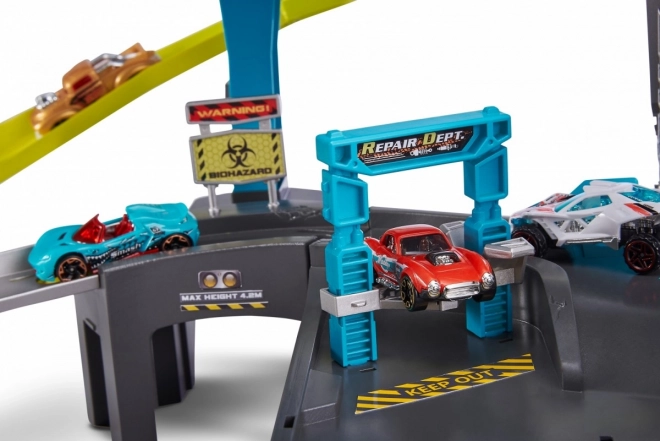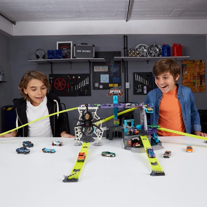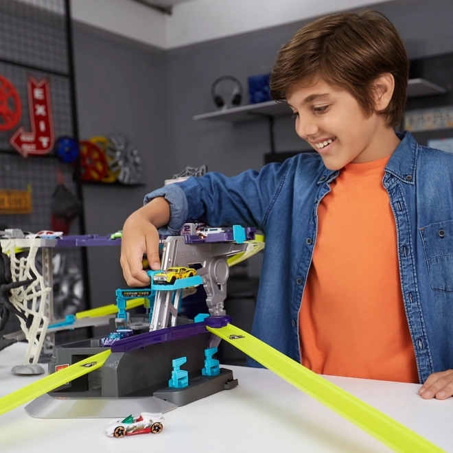 Tartalmaz egy átrendezhető versenypályát, amely akár 3,3 méter hosszú és parkolóhelyet is kínál több mint 8 autó részére. Rendelkezik még egy autóműhelgyel és garázzsal a járművek tárolására. Tulajdonosaik inspiráló játékélményeket élvezhetnek azáltal, hogy lengetik a pókot és egyedi útvonalakat alkotnak a felejthetetlen vezetési élményekért.