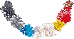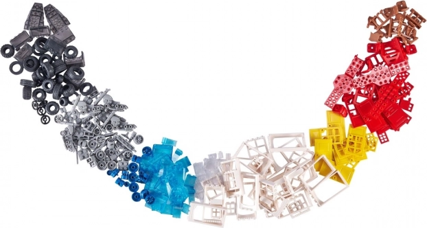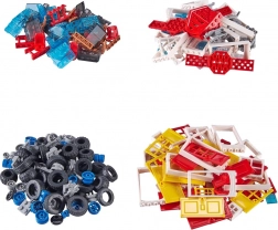 - Tartalmaz 250 darabot, amelyek alkalmasak házak és járművek építésére: ajtók, ablakok, tetőrészletek, tengelyek, karosszériák és kerekek.