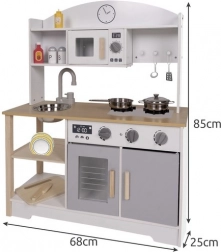 PRÉMIUM MINŐSÉG - a konyha kiváló minőségű fából készült, ami jelentősen befolyásolja a használat időtartamát, valamint a legkisebbek biztonságát és egészségét. Időtlen dizájn, amely minden kicsinek örömet okoz. Klasszikus formája miatt mindig nagyra értékelték. A kivételesen igényes kidolgozás, az esztétikus megjelenés és a legapróbb részletekre való odafigyelés többletértéket ad a terméknek és gyönyörködteti a szemet. A konyha dekorációs elemként is megállja a helyét, és dísze lehet a gyerekszobának.