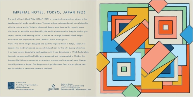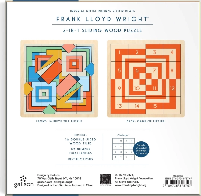 Elegáns, tolóelemes fa kirakó FRANK LLOYD WRIGHT – Imperial Hotel ikonikus dizájnja által inspirálva, 2 az 1-ben szórakozással: klasszikus motívumkirakás és a tizenötös játék logikai kihívása. Minőségi fa kivitel, kompakt méret és a pörgős elemtologatás teszi remek ajándékká és stílusos asztali kiegészítővé.