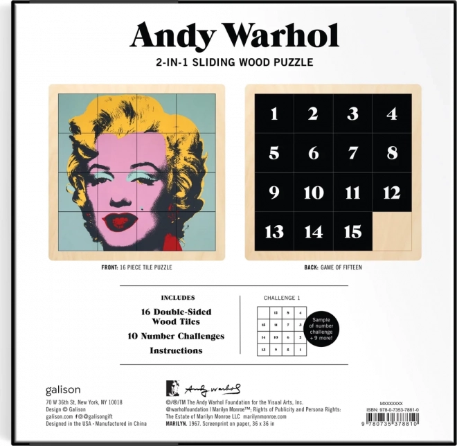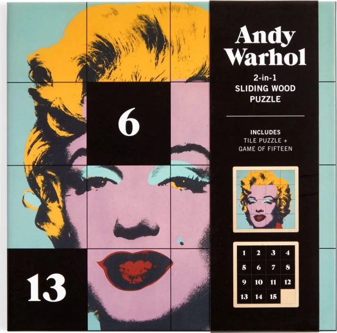 Ez az egyedülálló tolható fa puzzle órákon át tartó szórakozást és kreatív kihívást biztosít. Az egyik oldalon megtalálja az ikonikus Andy Warhol motívumot, a másikon egy számos rejtvényt: 15-ös játék. A puzzle mérete körülbelül 15 x 15 cm, és úgy lett kialakítva, hogy koncentrációt és stratégiát igényeljen.