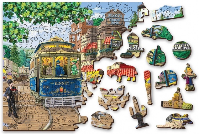 Az elegáns fa kirakó nosztalgikus utcai motívummal két utat kínál a befejezéshez: elől részletgazdag illusztráció, hátul minta a formák szerinti kirakáshoz. Magasabb nehézségi szint várja a különlegesen kivágott daraboknak köszönhetően, amelyek állatok, épületek és tárgyak alakját idézik, és apró figuraként is megállják a helyüket. Ideális választás felnőtteknek és gyakorlottabb fiatal kirakózóknak, akik egyedi kihívást keresnek.
