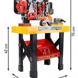 Ez a realisztikus gyerek műhely mindent kínál, amire egy kis barkácsolónak szüksége lehet. A masszív munkalap csavarhelyekkel, a működő satu és a függőleges fúró hiteles élményt ad. Az alsó tárolópolc, a rekeszek és az akasztók mindent a helyén és átláthatóan tartanak.