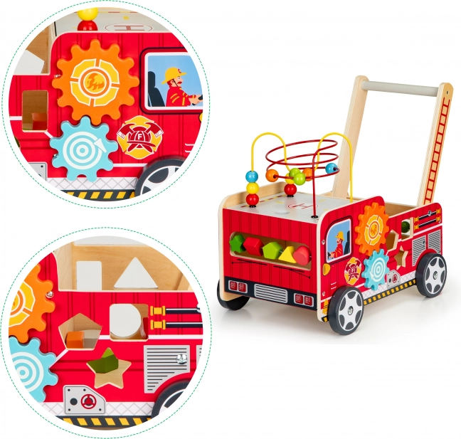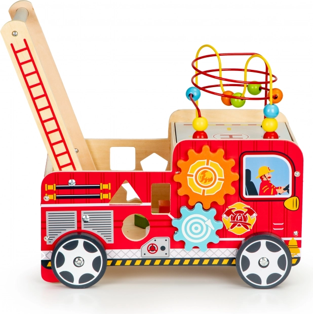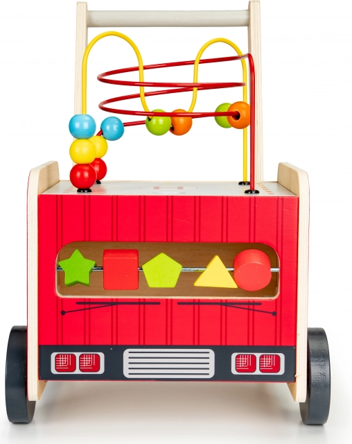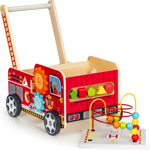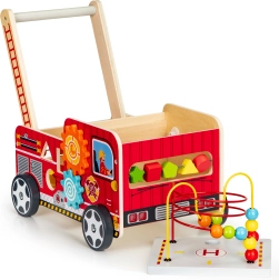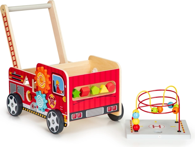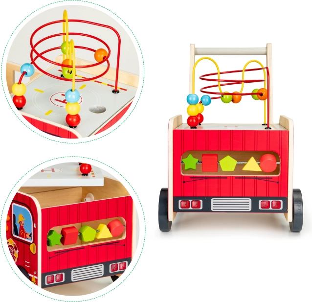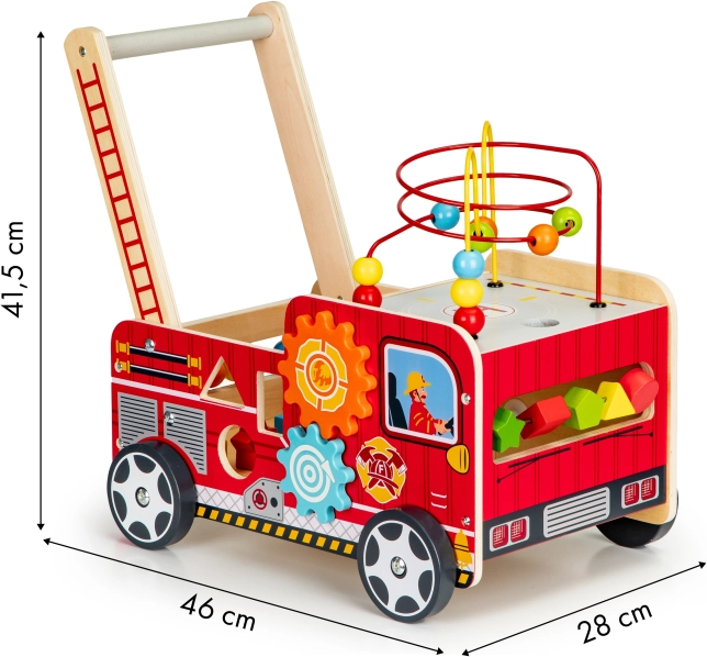A tűzoltóautó formájú fa járóka ideális első lépések segítője a gyermekének. A járóka úgy lett tervezve, hogy stabilitást biztosítson, és ugyanakkor szórakoztasson az interaktív elemek, mint például a fogaskerekek, gyöngylabirintusok és formaválogatók révén.