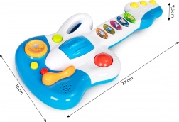 A gitár 5 színes gombbal van felszerelve, mindegyik különböző hanggal vagy dallammal. Egy másik vonzó funkció a forgó golyó, amely csörgőként funkcionál.