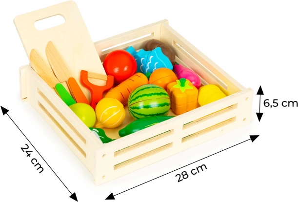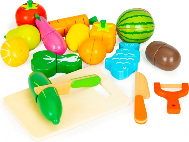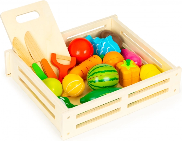 - Doboz, vágódeszka, 2× kés (imitáció), hámozó (imitáció), különféle gyümölcs- és zöldségdarabok