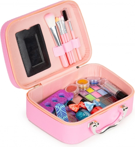 Varázslatos sminkelés a kis parádés lányoknak és fiúknak: praktikus bőrönd tükörrel, biztonságos és könnyen lemosható kozmetikai kiegészítőkkel és UV LED körömlámpával. A készlet fejleszti a kreativitást és a finommotorikát, és remek ajándék 3 éves kortól.