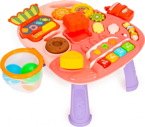 - Levehető interaktív panel: Tartalmaz zongorát, fogaskerekeket, formabedobót és labdakosarat három színes labdával.