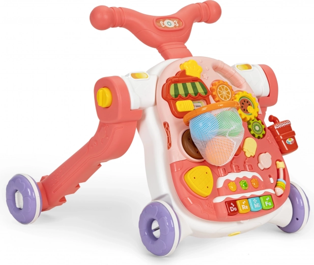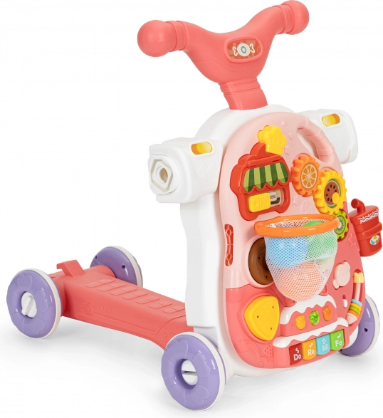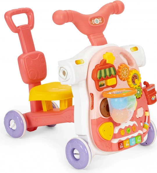 Tökéletes választás a kis felfedezőknek! Ez a kreatív játékszer egyesíti a tolójárgány, tanulóasztal, roller és hintaló funkcióit egy termékben, támogatva a gyermekek kognitív, motorikus és érzékszervi képességeinek fejlődését. A hangok, színek, formák és számok interaktív felfedezése segít az apróságoknak játék közben tanulni.