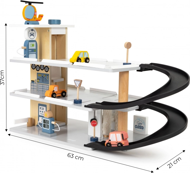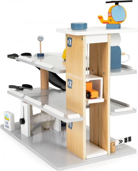 Ez a többszintes fa garázs igazi akciózónát kínál a gyerekeknek: az autók a rámpákon száguldanak a szintek között, megállnak a közlekedési tábláknál, és a mozgatható liftnek köszönhetően könnyedén jutnak fel és le. A tetőn heliport várja a mellékelt helikoptert.