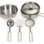 A készlet tartalma: két edény, fedél, merőkanál, spatula és lyukacsos kanál fémből. Minden eszköz úgy lett kialakítva, hogy biztonságos legyen a gyermekek számára.