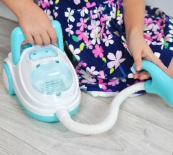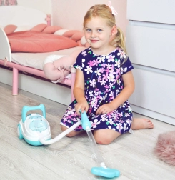 Ez a kék-fehér gyerek porszívó hűen utánozza a valódi készüléket – bekapcsolás után világít, valósághű hangokat ad, és a szívófunkció segítségével a mellékelt polisztirol golyócskákat is fel tudja szippantani. Remek szerepjátékhoz, fejleszti a felelősségtudatot, és játékos módon tanítja a gyerekeket a rendre.