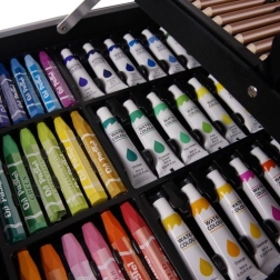 - 28× színes ceruza, 33× filctoll, 24× olajpasztell, 24× akvarellfesték, 24× akrilfesték, 2× radír, 2× paletta, 2× ceruza, 4× ecset, 1× hegyező, 1× bőrönd