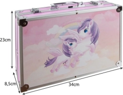 Az elegáns rózsaszín, unikornisos bőrönd egy gazdag, 144 elemből álló készletet rejt rajzoláshoz és festéshez. Mindennek megvan a helye az áttekinthető rekeszekben, így rendben tarthatja az eszközöket, és mindent gyorsan megtalál. A készlet fejleszti a kreativitást, a finommotorikát és a koncentrációt, és órákon át tartó szórakozást nyújt egyéni vagy csoportos alkotás során.