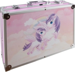 Fedezze fel a teljes festőkészletet masszív rózsaszín bőröndben unikornis motívummal – ideális gyerekeknek és kezdő alkotóknak. Belül mindent megtalál a rajzoláshoz, színezéshez és festéshez: filctollak, színes ceruzák, olajpasztellek, akvarell- és akrilfestékek, valamint praktikus kiegészítők. A rekeszes rendezőnek köszönhetően az eszközök áttekinthetően és biztonságban maradnak. A tartós fém sarkok és zárak védik a tartalmat szállítás közben.