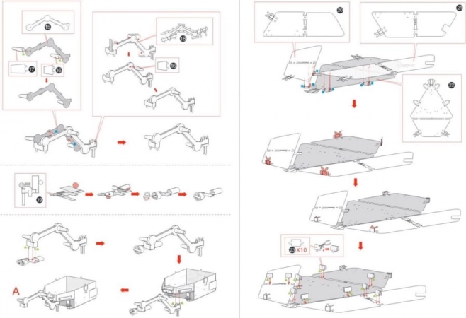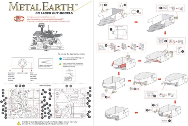 A modell összerakásához használja a 11 x 11 cm-es acéllemezeket, és kövesse a mellékelt útmutatót. Az elemeket kapcsokkal és nyílásokkal csatlakoztassa össze. Javasoljuk, hogy használjon kis vékony fogót, ami azonban nem része a csomagnak.