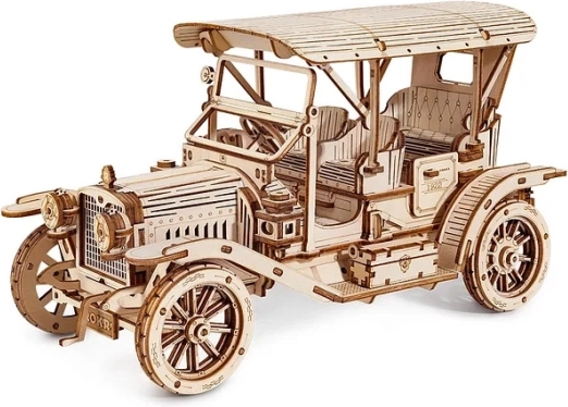 A RoboTime fa 3D puzzle történelmi autója a réz korabeli vintage járművek hiteles mása, melyet a 20. század 1910-es éveinek járművei ihlettek. Az áramvonalas sárvédő és elegáns vonalak a lovaskocsik megjelenését idézik, autentikus részletekkel, mint a váltókar és kényelmes ülések – mindez hozzájárul a modell egyediségéhez.