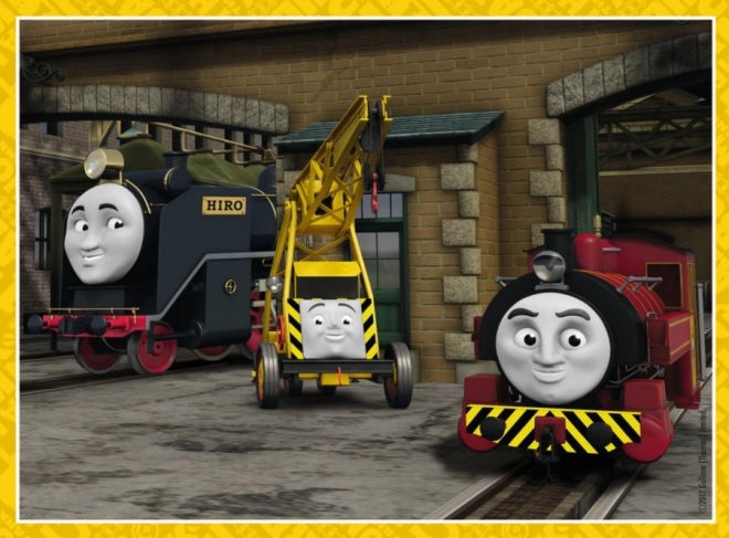 Négy kirakó különböző nehézségi szinttel, 12-től 24 darabig, Thomasszal, a gőzmozdonnyal és barátaival. Ajánlott 3 éves kortól. Az összeállított puzzle mérete kb. 4 × 19 × 14 cm