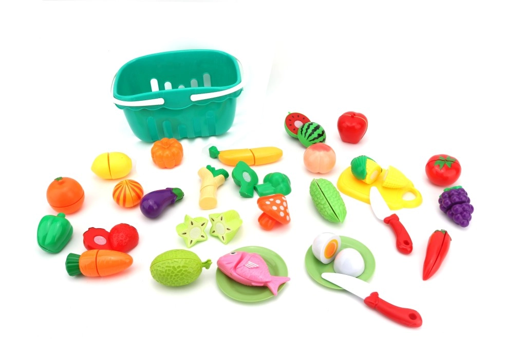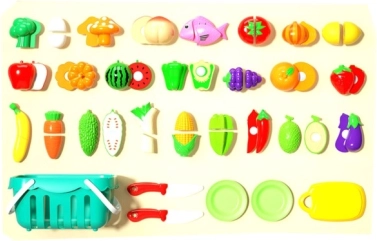 - 30 darabos készlet gyümölcsökkel, zöldségekkel, hallal, tányérokkal, vágódeszkával és késekkel