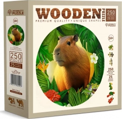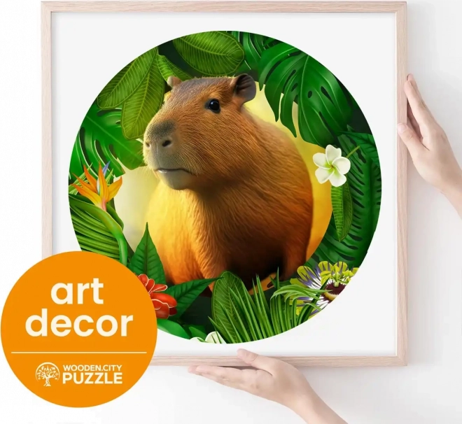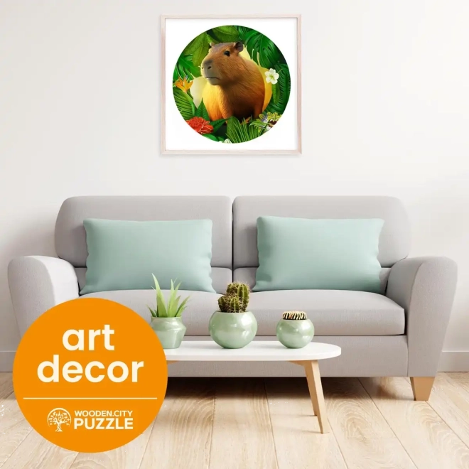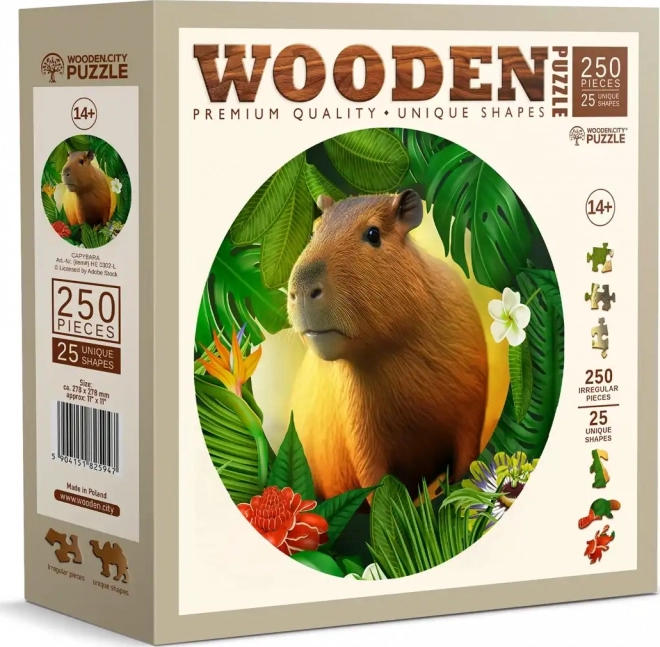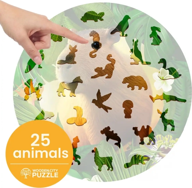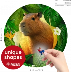 A WOODEN CITY fa puzzle kapibara motívummal egyedülálló kirakóélményt nyújt. A speciálisan formázott elemek, amelyek közül néhány állat alakú, minden egyedi puzzle rajongót elbűvöl. A lézerrel kiemelt részletek mélységet adnak a képnek, és az egyes formájú elemek önállóan is megállnak, mint kis figurák.