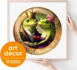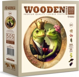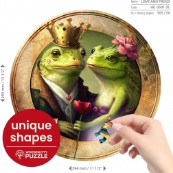 Fa puzzle Szerelem és békák a WOODEN CITY-től egy egyedülálló építőkészlet lézerrel kivágott darabokkal. Ez a készlet rendkívüli szórakozást nyújt az összeállítás során, állatformájú darabokkal, amelyek kis figurákként is megállják a helyüket.