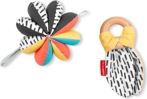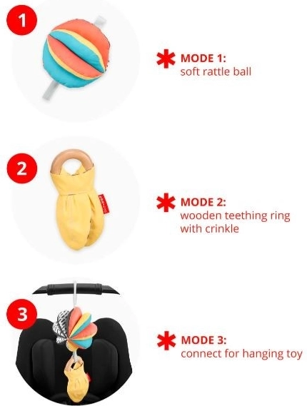A DISCOVEROSITY 3 az 1-ben játékunk három különböző játékélményt nyújt, mivel az egyes tárgyak külön-külön is használhatók vagy összeilleszthetők. A puha csörgő egyik oldala kontrasztos mintával, míg a másik élénk színekkel rendelkezik. A fából készült gyűrű fenntartható anyagokból készült. Ez a komplex dizájn ideális a fogásra és rágásra egyaránt.