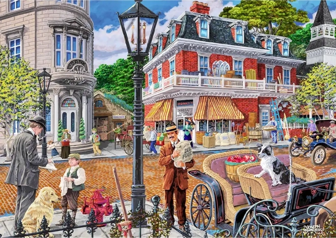 Élénk illusztráció korabeli házakkal, kocsikkal és nyüzsgő piactérrel, amely vizuálisan vonzó élménnyé teszi a kirakást gyermekeknek és felnőtteknek egyaránt.