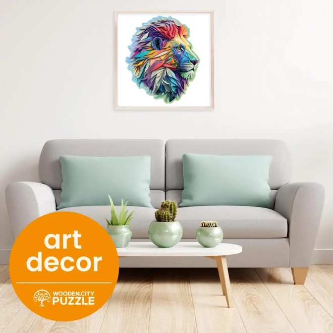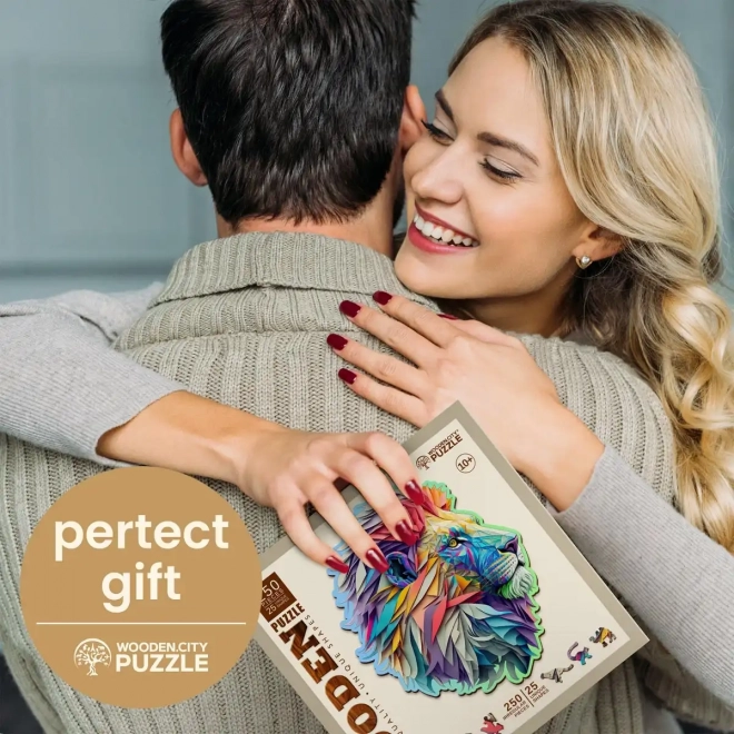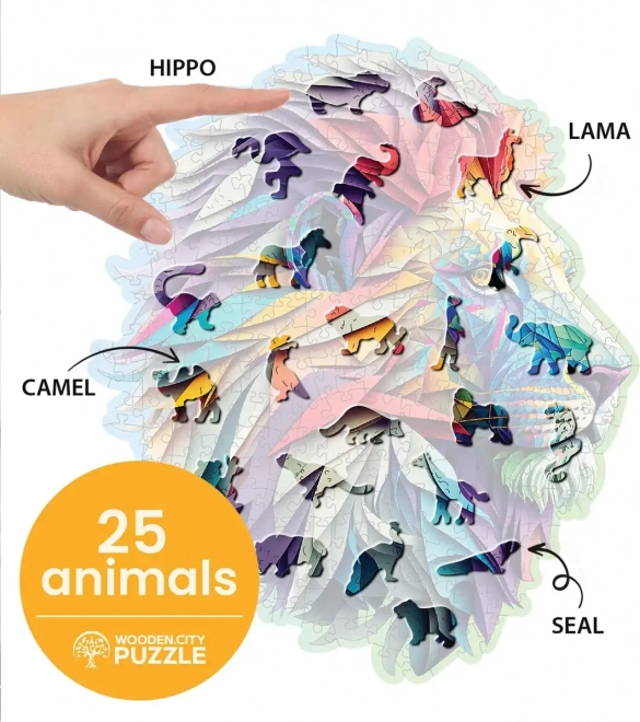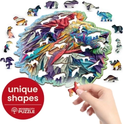 Élvezze az egyedi kirakóélményt a WOODEN CITY Modern oroszlán fa puzzléval. A különleges formájú elemek, amelyek egy része állatokra emlékeztet, összeállítva látványos motívumot alkotnak kiemelt, lézeres részletekkel. Néhány darab önállóan is megáll, mint apró figurák.